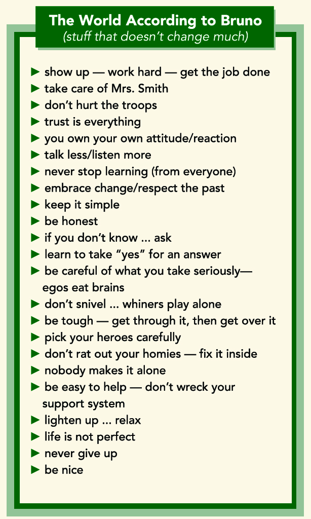 A good place to start is with Alan V. Brunacini’s list of boss behaviors titled “The World According to Bruno,” which I found on a card while going through his vast collection of leadership notes.